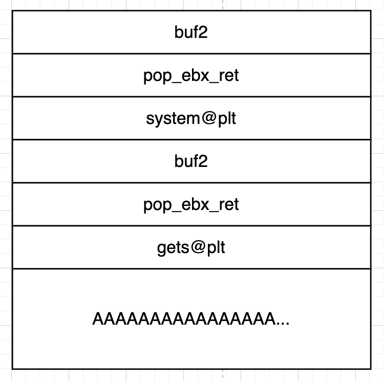 使用pop ebx ret,刚好填补了两个字的间隔,使得gets函数成功获取其输入的参数,同时也能成功弹出buf2在栈中的内容。使用pop ebx ret,这里不一定必须ebx,只要是通用寄存器存放栈中弹出的数据就好了。